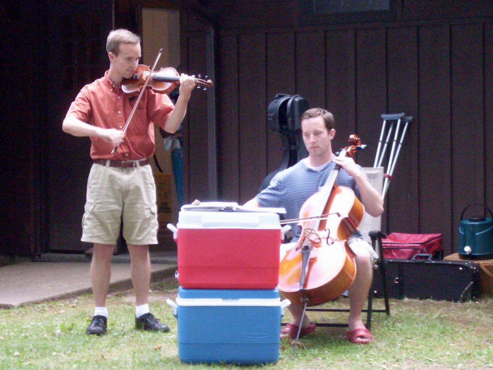 Thank you for the music -- "young" Davey DeVowe's older sons entertained us with music! Steven played his (our Grandfather's and refurbished) violin for us, and Michael played the cello -- beautiful music floated over us. The hymns were wonderful, and my tears came when they played "How Great Thou Art", that beautiful Swedish hymn.